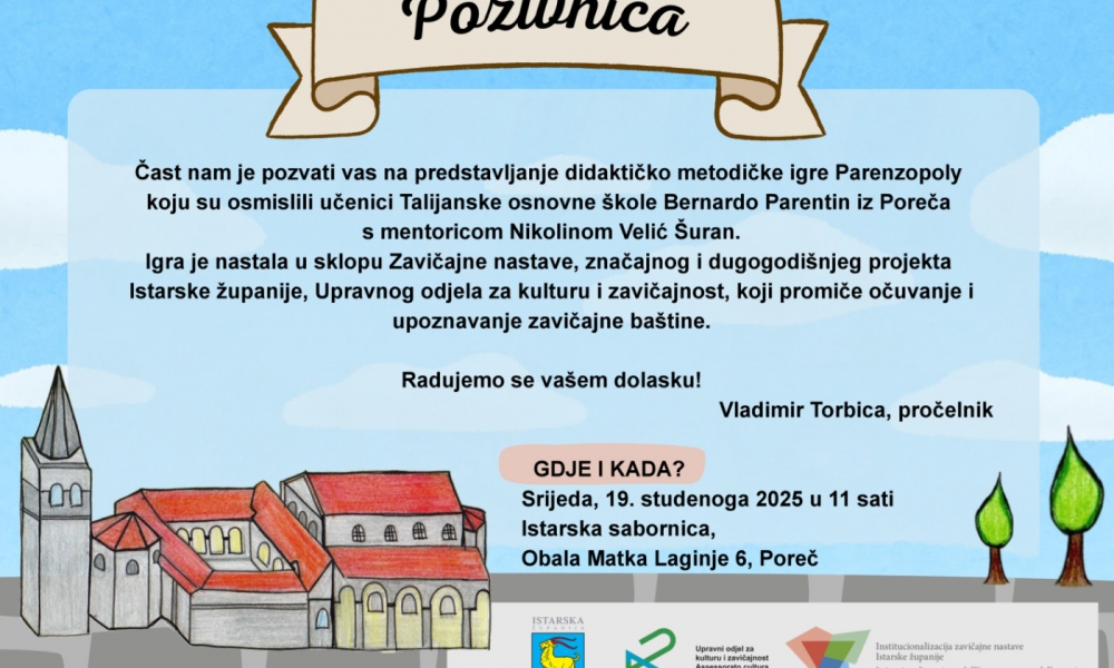 È con grande entusiasmo che vi invitiamo alla presentazione ufficiale di “Parenzopoly”, un gioco didattico-metodico ideato dagli alunni della Scuola Elementare Italiana Bernardo Parentin di Parenzo, alla guida dell’insegnante di storia Nikolina Velić Šuran. L’iniziativa è sostenuta dalla Regione Istriana, che ha creduto nel valore educativo e culturale del progetto e ne ha reso possibile la realizzazione.